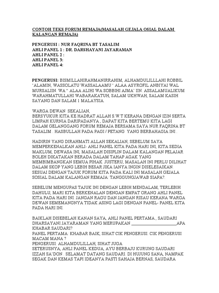 CONTOH TEKS FORUM REMAJAMASALAH GEJALA OSIAL DALAM KALANGAN REMAJA CONTOH TEKS FORUM REMAJAMASALAH GEJALA OSIAL DALAM KALANGAN REMAJA PENGERUSI. GEJALA SOSIAL DI KALANGAN REMAJA Remaja merupakan golongan pewaris kepimpinan hari ini dan penerus wawasan negara. Teks forum remaja 2018 edit doc pengerusi assalamualaikum.